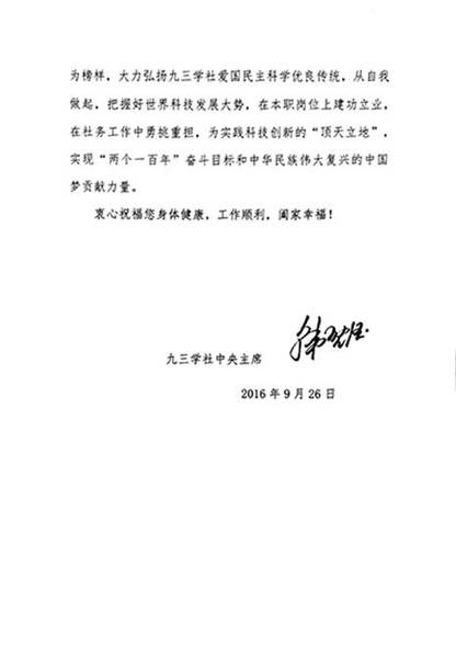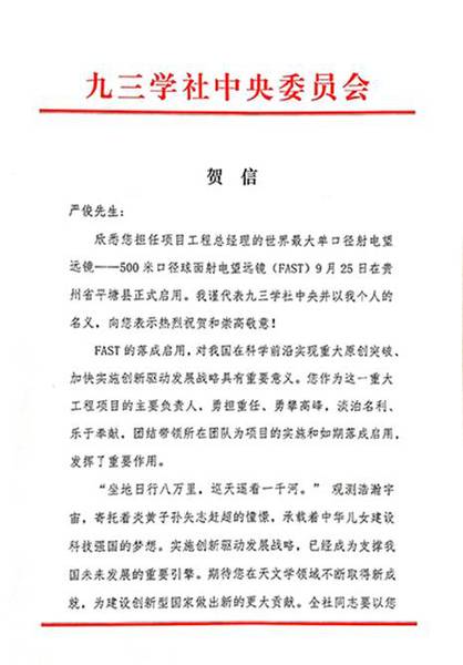 9月25日,有着“天眼”之称的500米口径球面射电望远镜(FAST)在贵州省平塘县落成启用,标志着我国在科学前沿实现重大原创突破。获悉这一喜讯后,全国政协副主席、九三学社中央主席韩启德立即致信九三学社中央常委、中国科学院国家天文台台长、FAST工程项目总经理严俊,表示热烈祝贺和崇高敬意。