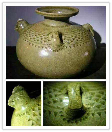 最后从器型演变上看,东西两晋还是有一些明显的变化,这时期器物造型的发展更趋向于实用性,西晋时一度大量生产的冥器,进入东晋后基本停烧,与此同时还出现了一些新器型,如牛形灯、圆形格盘和莲花尊等。器物的造型上也有了明显的变化,由西晋时的矮胖逐渐向高瘦的方向发展,变得更为秀气、简朴,注重经济实用,就以当时最具代表性的两种器物——盘口壶和鸡首壶为例。早期的盘口壶,盘口和底部都较小,上腹特大,重心在上部,倾倒食物相当费力,占据的平面也较大,而且还给人以不稳定的感觉。进入东晋后,盘口加大,颈部增高,腹部修长,各部位比例协调,线条柔和、造型优美、重心向下、放置平稳,使用时也较为省力。而早期的鸡首壶,多数是在小小的盘口壶的肩部一面堆贴鸡首,另一面贴鸡尾,头尾前后对称,鸡首为实心,完全是一种装饰。东晋时,壶身变大,前面装鸡首,引颈高冠,鸡首是空心的作为壶流,后安圆股形把手,上端粘在器口,下端贴于上腹部,到了东晋中晚期,在把手的上端装饰龙头或熊纹,器型优美!俨然成为一种很好的酒器。