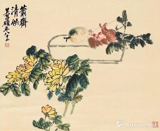“四君子”、“岁寒三友”题材一直为画家钟爱,除却梅、兰、竹、菊、松自然形色入画,更多托物言志之意。吴昌硕画坛巨擘,于“四君子”等题材同样情有独钟,他笔下的梅花、竹子、兰蕙几乎俯拾皆是,向来为人激赏,而菊花就少得多。个中缘由,想来前者更适合逸笔草草地点写,更容易发挥笔墨效果,而菊花造型相对复杂,再怎么解衣盘礴,总得耐着性子把特征交待清楚,含糊不得。