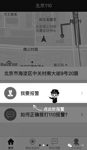 110手机报警平台首期开通4个功能??椋拔乙ň?、“附近派出所”、“常见问题”、“个人中心”。在“北京110”手机报警平台有两种报警方式,第一种是将“北京110”APP作为报警端报警,第二种是嵌入“360手机卫士”的“北京110”模块作为报警端报警。