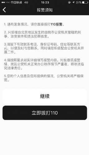 2 在注册成功后进入报警界面,弹出“报警须知”,点击“继续”,进入报警主页面,就可以报警了。