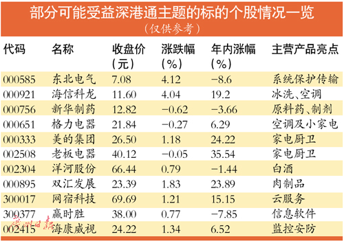 中金公司分析师王汉峰表示,从短期到中期,受益深港通的标的主要是香港市场大盘及中盘股票中的A 股相对稀缺的优质个股。银河证券首席策略分析师孙建波则指出,深港通推出后A 股估值体系将进一步与国际成熟市场估值体系接轨,对A 股大盘蓝筹股有一定的估值修复作用。同时,利好券商,尤其是在港券商,因为香港券商佣金费率更高,弹性更大。另外,A股低估值有业绩的白马成长股、消费股以及高股息股票也会受到境外资金的青睐。