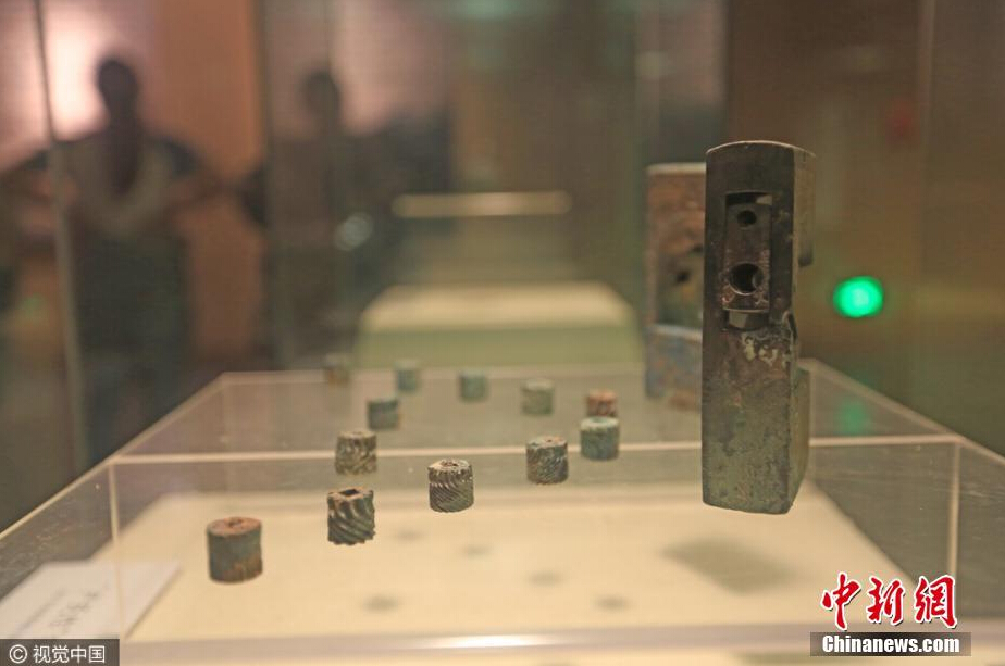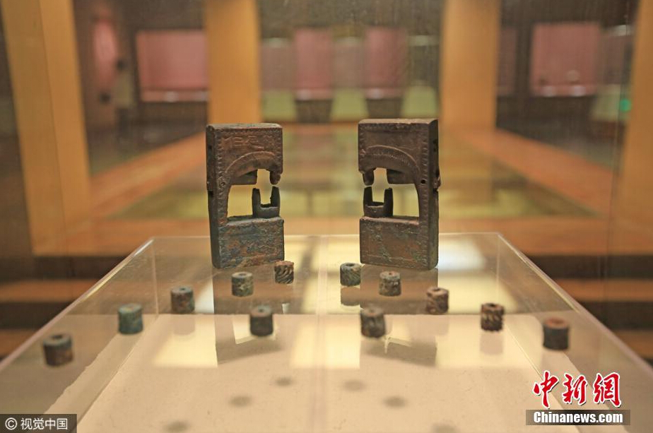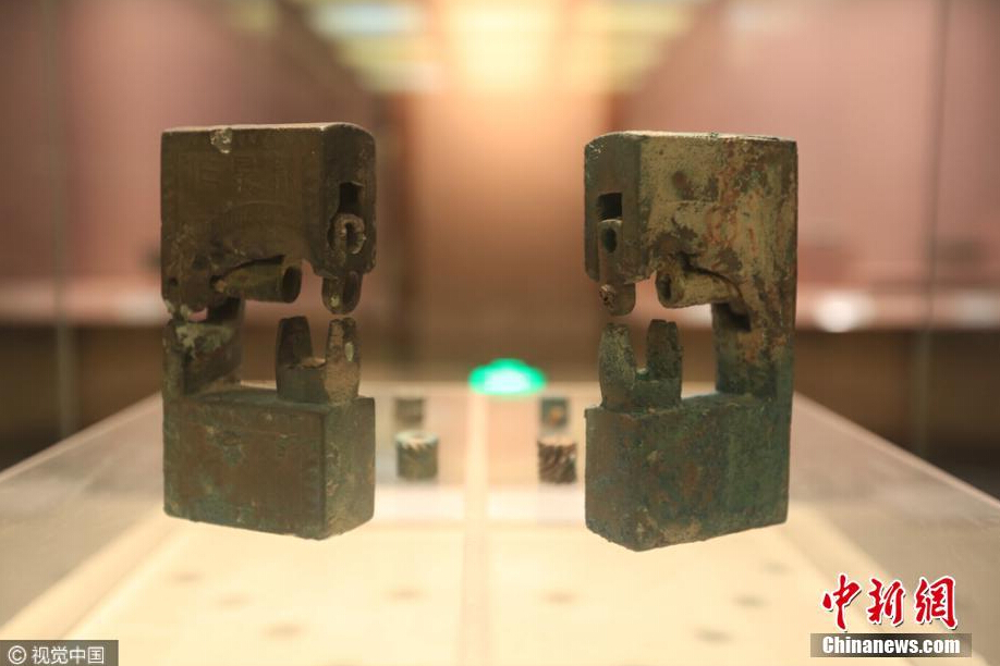 2016年9月28日,湖北省襄阳市,展出一对三国早期的“严氏作”铜锁。这二件铜锁8年前出土于该市樊城区菜越一座大型三国夫妻合葬墓。据专家考证,该墓墓主是较列侯一级略低的将军夫妇,男、女墓主先后下葬。出土有陶、瓷、铜、铁、银、金、铅锡、漆、玉、石、水晶玛瑙、骨、玻璃、琥珀等文物200余件。该铜锁长13.2宽6.6厚3.1厘米,相当于一张名片的尺寸大小。锁的正背面边沿饰锯齿纹,一面有隶书体“严氏作”铭文,意为姓严的锁匠加工制作。从锁的质地和做工来看,非常精致,堪称工匠精神的代表作品。而把此锁称之为“连心锁”的不凡之处在于,当年两锁出土于双棺之间,且并未同实用器物放在一起,考古专家推测两位墓主人仍希望在阴间继续作夫妻,赋予其“连心”之意。图片来源:视觉中国