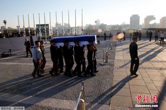 当地时间2016年9月29日,耶路撒冷,护卫队将佩雷斯的灵柩移送至议会广场。