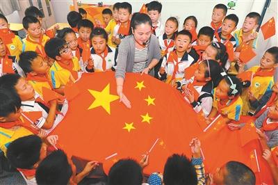 9月26日,少先大队辅导员在给小学生讲解国旗知识。安徽省阜阳市和谐路小学开展“祖国在我心中”主题教育活动,喜迎新中国67岁生日。