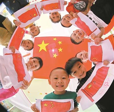 9月27日,小朋友展示手绘国旗。河北省秦皇岛市海港区东方明珠城礼仪幼儿园开展“手绘国旗迎国庆”主题活动,表达对祖国的热爱之情。