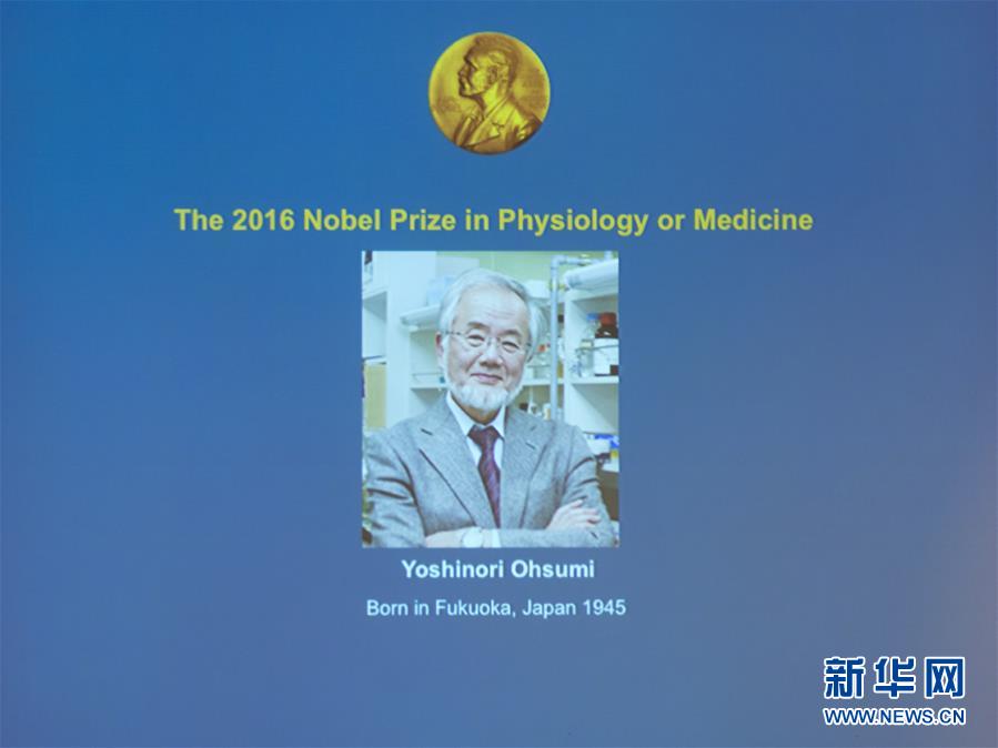 10月3日,在瑞典斯德哥尔摩,获得2016年诺贝尔生理学或医学奖的日本科学家大隅良典的肖像在新闻发布会上展示。瑞典卡罗琳医学院3日宣布,日本科学家大隅良典获得2016年诺贝尔生理学或医学奖,以表彰他在细胞自噬机制研究中取得的成就。新华社发(石天晟摄)