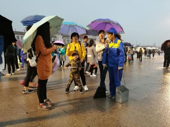 关键词:天安门广场下雨 天安门广场 为环卫工打伞