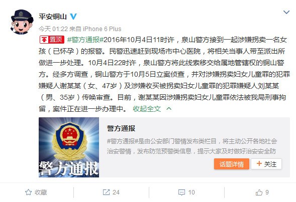 通报称,2016年10月4日11时许,泉山警方接到一起涉嫌拐卖一名女孩(已怀孕)的报警。民警迅速赶到现场市中心医院,将相关当事人带至派出所做进一步处理。10月4日22时许,泉山警方将此线索移交给属地管辖权的铜山警方。