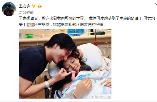 据悉,王力宏2013年11月与李靓蕾结婚,2014年7月大女儿王嘉莉出生,现二胎再获一个女儿。