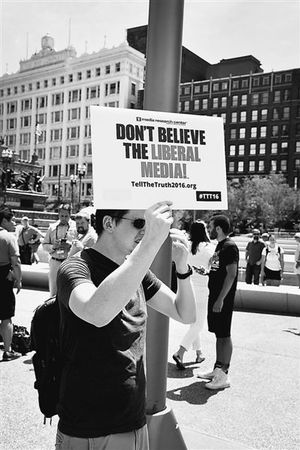 2016年美国大选饱受争议,广大选民的不满情绪和对未来的不确定感骤然增加。 美国民众在克利夫兰街头,高举标语抗议带有偏见的媒体。 本报记者 章念生摄 |