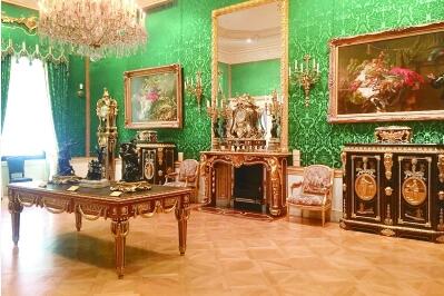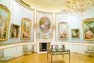 椭圆形客厅里陈列着法国洛可可风格的油画,其中最具代表性的两幅分别为布歇的篷巴杜夫人画像和弗拉戈纳尔的《秋千》。