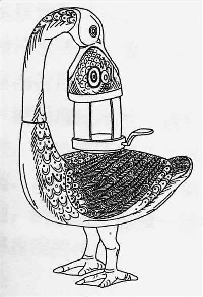 在汉代,雁鱼构成一种吉祥图案,釭灯制成此型,无疑更会博得人们的喜爱。高度概括的造型和精湛的工艺,反映了当时人们融环保理念与审美思想为一体的艺术追求。
