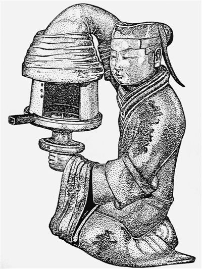 河北满城一号西汉墓曾出土有环保釭灯——从灯室到灯腹间连接着一道烟管,能将灯烟导入腹内,而灯腹内壁上尚存一薄层白色水碱,证明其中曾贮水。聪明的古人将灯加设烟管,将灯烟导入灯腹的水中,这样就会减少烟炱而使室内保持清洁,无疑起到了环保的作用。在湖南长沙五里牌四〇一号西汉墓中,还曾出土过装有双烟管的灯,这样烟气的流散就会更加通畅。