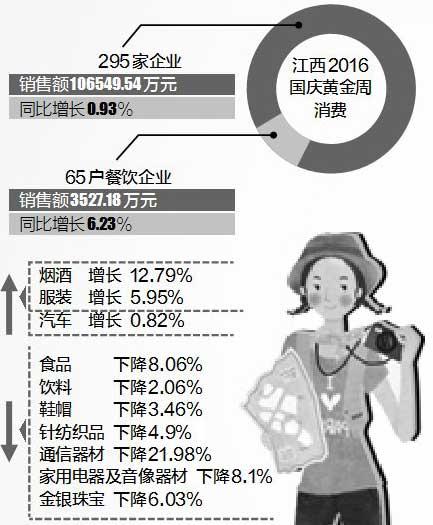 中国江西网讯 刚刚结束的国庆黄金周,江西省商务厅重点监测的295家企业销售额106549.54万元,同比增长0.93%。记者8日从江西省商务厅获悉,2016年江西省国庆黄金周消费市场运行情况显示,吃穿用等刚性消费需求均有不同程度下降,食品、饮料、鞋帽、针纺织品有不同程度下跌。降幅最大的通信器材行业下滑21.98%。国庆节是结婚高峰时期,婚礼宴会较多,烟酒类商品消费增长12.79%。服装、汽车销售同比分别上涨5.95%、0.82%。