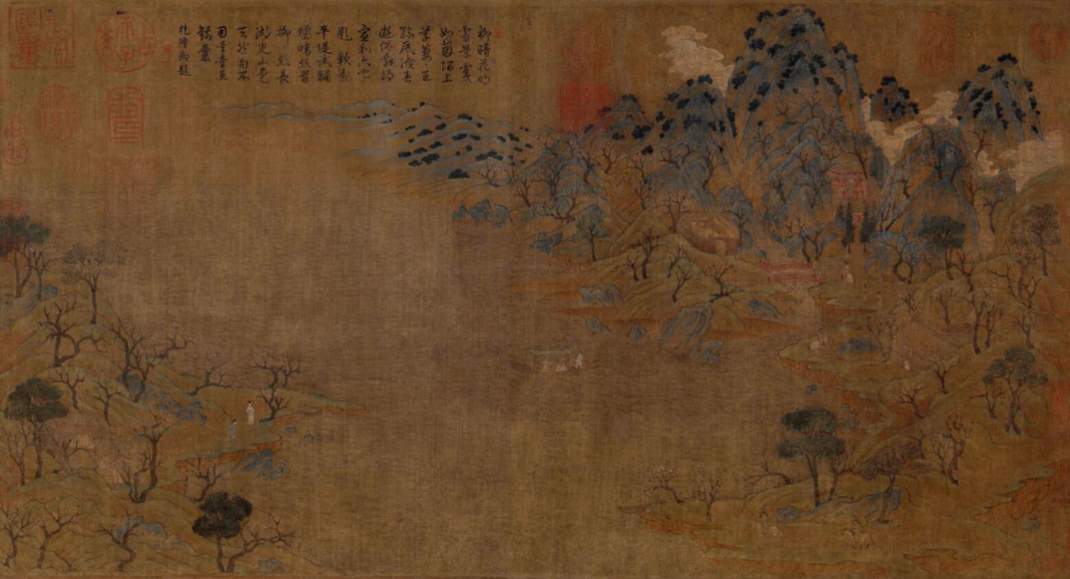 传为展子虔所作《游春图》(宋摹本),描述春天人们出游踏青时乘马至岸、乘舟于水观景的内容。中锋勾勒,山石略有皴擦几乎平涂,且颜色已有变化,阳面用青绿、山脚用赭石。