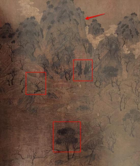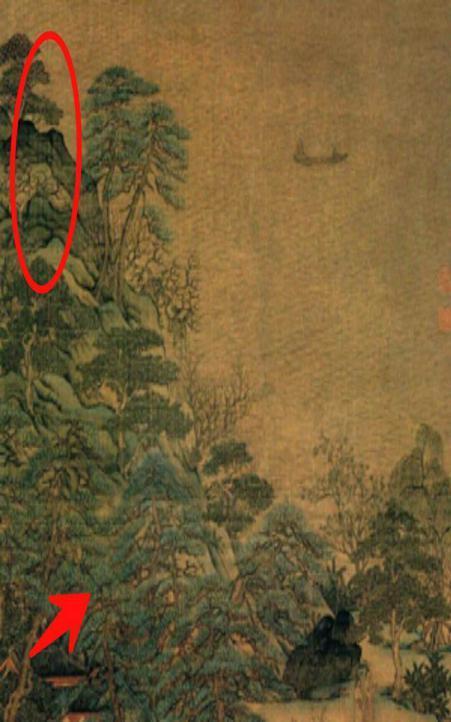 树木仍然稚拙,远景树木绘画一堆一堆的,缺乏层次,只是随着山石穿插。而中景与近景树的姿态已经较之晋代有了弯曲、穿插及大小的变化。且树叶法有介字、胡椒、大混点。(明显是唐五代以后风格)。下节笔者会描述到唐五代风格,可作参考比较。