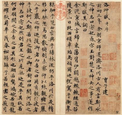 图十二赵孟頫《小楷洛神赋册》(元代书法以赵体为宗,结体紧致,婉转流畅,柔媚之气明显,但外柔内刚。明董其昌师承赵孟頫,后被康熙帝大加推崇)