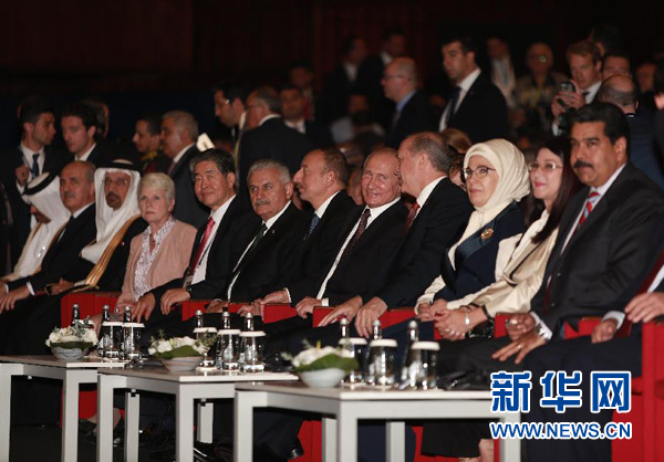 10月10日,在土耳其伊斯坦布尔,俄罗斯总统普京(右五)与土耳其总统埃尔多安(右四)在世界能源大会上交谈。新华社/伊斯坦布尔分社通联