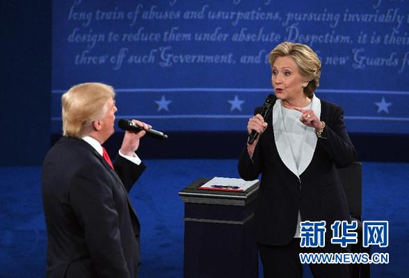 10月9日,在美国密苏里州圣路易斯市的华盛顿大学,美国共和党总统候选人唐纳德·特朗普(左)和美国民主党总统候选人希拉里·克林顿参加2016年美国总统候选人第二场电视辩论。新华社记者殷博古摄