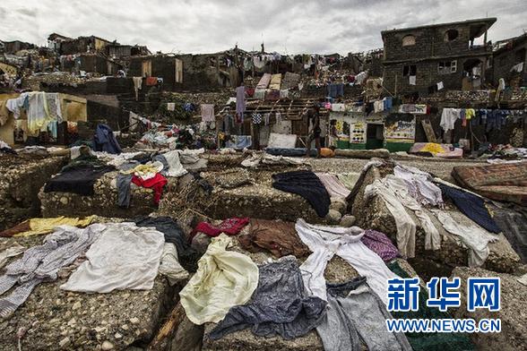 10月6日,在海地热雷米,村民的衣物被放置在废墟之上。联合国人道主义事务协调厅7日发布最新报告说,飓风“马修”造成海地130万人受灾,其中75万人迫切需要紧急援助。新华社发(联合国海地稳定特派团供图)