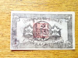 今年是长征胜利80周年,在天津钱币学会会员、天津市文博学会民间收藏专业委员会委员张宗彩的藏品中,有两张红军长征时期使用的纸币,一张为中华苏维埃共和国国家银行于1933年发行的“伍角”纸币,另一张为中华苏维埃共和国国家银行湘赣省分行于1934年发行的“十枚”纸币。虽已过去80余年岁月,两张纸币上已浸染出淡黄色的包浆,但它们票面完整,图案、文字清晰可辨。