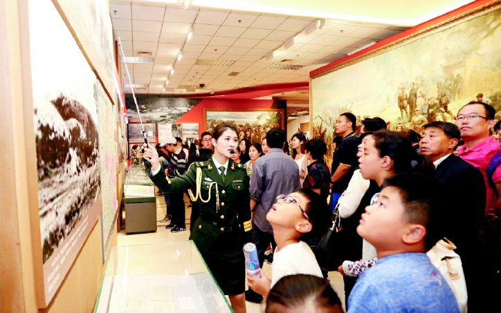 国庆假期,近6万人次参观了“英雄史诗 不朽丰碑———纪念中国工农红军长征胜利80周年主题展览”,图为解说员在为参观者讲解。 新华社发