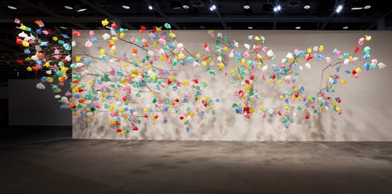 去年的瑞士巴塞尔艺术展上,一个名为《塑料树》的作品显得非常惹眼。该作品发伸于一面巨大的墙,支出的干枯树桠上挂满了五颜六色的塑料袋。这个装置艺术的作者帕斯卡尔?马修?塔悠(Pascale Marthine Tayou)将该作品诠释为“树之花”,他表示该作品是一种综合了建筑、自然、人工合成元素,并与辐射和基因改造有关的奇异突变。在巨大的展厅里,遒劲苍老的树枝与柔软轻盈的塑料袋形成奇异的对比,这些色彩缤纷的塑料袋真的如花般闪耀。当然,塑料袋闪耀的只是观者的眼,环保理念想必已经闪耀在心里了。