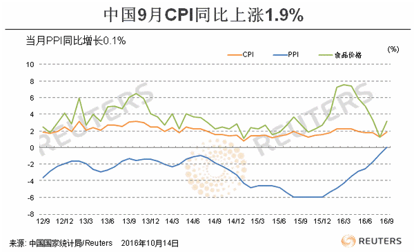 中国国家统计局周五公布,9月工业生产者出厂价格指数(PPI)同比上涨0.1%,高于路透调查预估中值的下降0.3%,自2012年3月以来首次由负转正;当月居民消费价格指数(CPI)同比上涨1.9%,高于路透调查预估中值1.6%。
