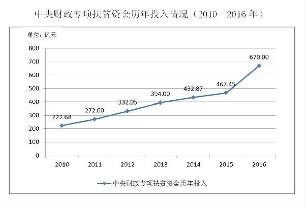 图表:中央财政专项扶贫资金历年投入情况(2010—2016年) 新华社发