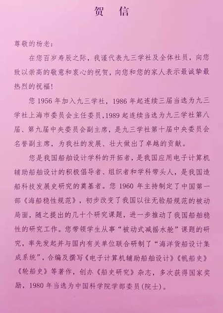 信中说,杨槱为九三学社的发展壮大做出了卓越贡献。作为我国船舶设计学科开拓者,杨槱是应用电子计算机辅助船舶设计的积极倡导者、组织者和学科带头人,是我国造船科技发展史研究的奠基者。信中写道,您的生命,在年富力强时熠熠生辉,在耄耋暮年时更加壮志高风……您不论学问还是品德,都是值得所有九三人学习的榜样。
