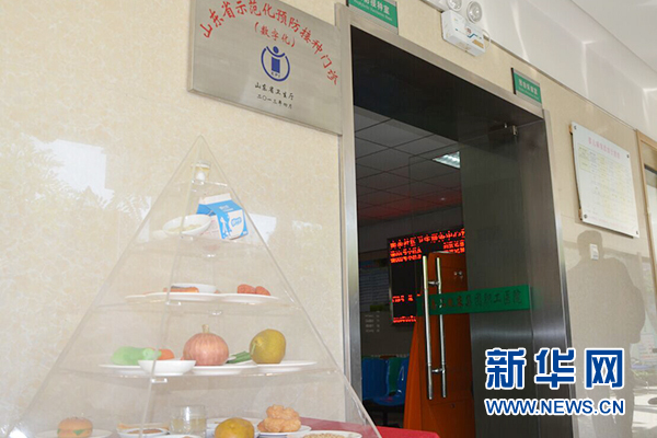 山东大力推广普及健康生活方式,图为济南市南辛社区卫生服务中心预防接种门诊前的膳食宝塔。新华网 刘映 摄