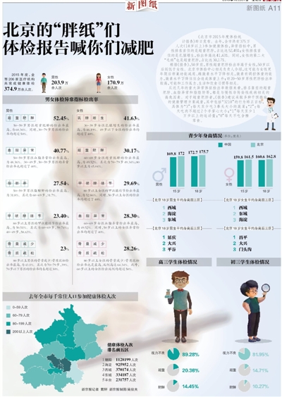 《北京市2015年度体检统计报告》昨日发布。去年,全市共有375万人次(18岁以上)参加健康体检,异常指标中,男性排在首位的是超重肥胖,占比达52.45%;女性排在首位的是乳腺增生,检出率高达41.63%。同时,女性的第二大“毛病”也是超重肥胖,占比达30.17%。