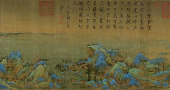 王希孟《千里江山图》,绢本青绿设色,纵51.5厘米、横1191.5厘米,北京故宫博物院藏王希孟《千里江山图》,绢本青绿设色,纵51.5厘米、横1191.5厘米,北京故宫博物院藏