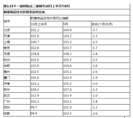 9月开始多个城市陆续出台的楼市调控措施效果正在显现,10月上半月已经有15个热点城市的房价环比涨幅出现回落。