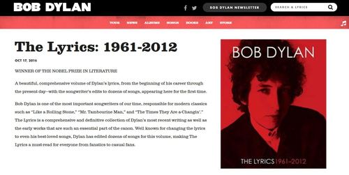 本报讯(记者路艳霞)10月13日,2016年诺贝尔文学奖授予美国歌手兼诗人鲍勃·迪伦,此后引发全球文化界广泛关注,随之各种鲍勃·迪伦将拒领诺奖的新闻也不绝于耳。今天上午,据新华社发布的最新消息,鲍勃·迪伦个人官方网站18日作出了更新:在网页上一处并不显眼的位置——“迪伦的书”一栏下的“迪伦歌词:1961年至2012年”标题上,添加了大写的“诺贝尔文学奖得主”的字样。这应该是诺贝尔文学奖揭晓后,鲍勃·迪伦首次以自己的方式对获奖作出回应吧。