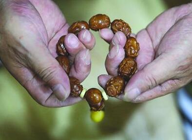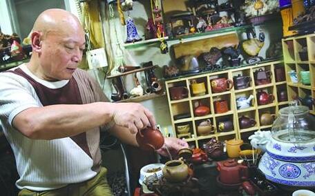 在众多藏品中紫砂壶“享受”着“一等公民”的待遇,也是他最精通、最喜爱的“宝贝”,紫砂壶基本上都“安居”在红木橱里。在众多的紫砂壶里有一把朱泥紫砂 壶十分显眼,壶形不大却精巧,壶体上有一排不规律的铜钉,犹如同一条高低起伏的“围栏”贯穿壶身,与壶体浑然一体。原来是紫砂壶被打破后,请修陶瓷的工匠 师进行“打铜钉”修补,不但恢复紫砂壶的功能,而且,使紫砂壶更加具有历史的陈旧感,别有特色。