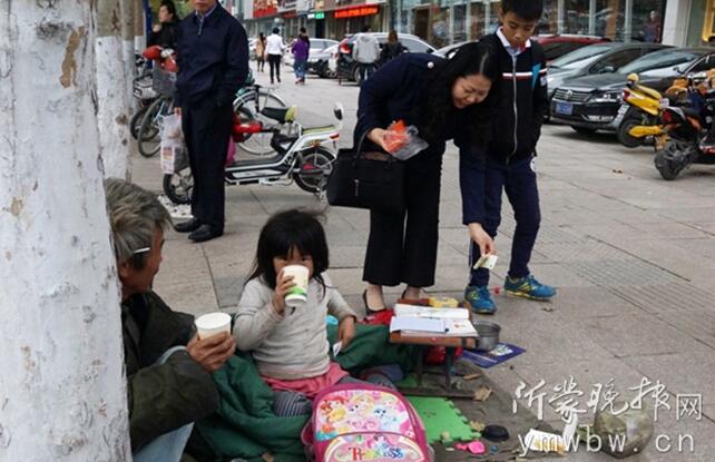 23日,临沂骤然降温,最低温只有10度。呼呼的北风和绵绵秋雨,让人感受到了秋末的萧索。在这样的天气下,很多市民发现,一个小女孩跟随一个成年 男子在寒风中乞讨,小女孩躲在薄被里认真写作业。小女孩从哪来?她为什么在寒风中乞讨?带着这些疑问,记者赶到了沂蒙路与红旗路路口。