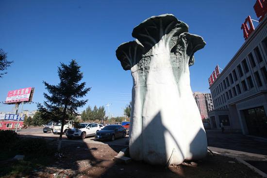 2016 年10月9日,长春市长沈路附近一商家在门前摆放5米多高的白菜形建筑雕塑,让过往的市民无不侧目观看。白菜全身用特殊防水石料制成,底部直径有近两米, 高度近6米,底部用钢筋支撑固定。附近居民称,商家透漏此建筑物的价格不菲,开业就将白菜矗立在此,寓意取的是谐音白菜百财。