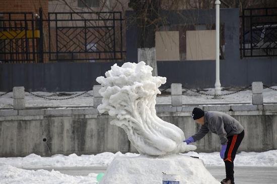 2015年12月21日,吉林省吉林市,62岁的退休教师刘庆武在落马湖公园冰面上制造3米多高的冰雪大白菜。