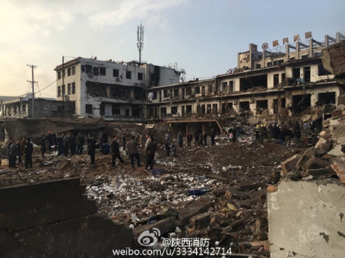 今日14时03分,陕西府谷县新民镇新民医院对面一彩钢房发生不明物爆炸,周边房屋不同程度受损,有民众被困。