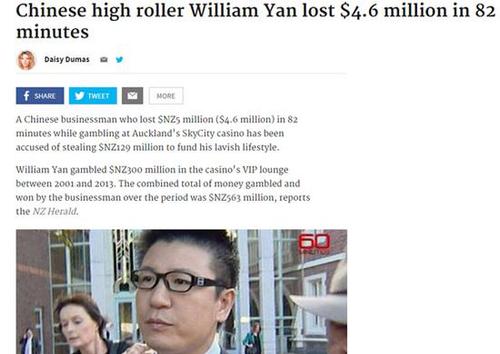 据《新西兰先驱报》2016年2月的报道,因涉嫌洗钱案件,警方公布资料显示,闫永明在2001年到2013年间,在奥克兰的“天空城”赌场输掉了3亿新元,曾创下在82分钟内输掉500万新元的记录。
