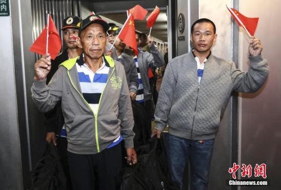 10月25日,遭索马里海盗劫持的阿曼籍台湾渔船“NAHAM3”上的9名中国船员抵达广州。2016年10月22日,遭索马里海盗劫持的阿曼籍台湾渔船“NAHAM3”上的9名大陆船员、1名台湾船员和其他国家船员26名幸存人员全部安全获救,并在联合国有关机构协助下于23日抵达肯尼亚。25日,除一名大陆船员因健康原因暂留肯尼亚接受进一步治疗外,其余9名获救中国船员乘坐南航班机返回广州。 中新社记者 钟欣 摄