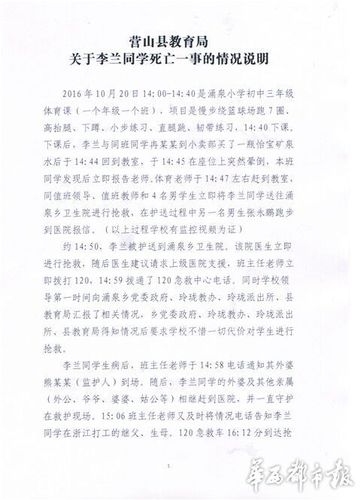 10月24日下午,营山县教育局就此事回复称,10月20日下午14:00——14:40是涌泉小学初中三年级体育课(一个年级一个班),项目是慢步绕篮球场跑7圈、高抬腿、下蹲、小步走、直腿跳、韧带锻炼,下课后,李兰与同班同学冉某某到小卖部买了一瓶矿泉水,于14时44分回到教室,14时45分在座位上突然晕倒,同班同学发现后立即报告老师。体育老师14时47分左右赶到教室,同值班领导、值班教师和4名男同学立即将李兰送往乡卫生院抢救,在护送过程中,另一名男生小张跑步到医院报信。营山县教育部门在回复中称,整个过程有学校监控视频为证。