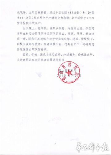 营山县教育局调查,当天下午2点50分左右,李兰被送到乡卫生院接受抢救,随后医生建议请求上级医院支援,班主任随即拨打了120,同时学校给当地相关部门汇报了此事。期间,班主任打电话通知李兰外婆熊某某到场,随后,李兰的外婆及其他亲属相继赶到医院,一直守护在救护现场。下午3点06分,班主任老师又将情况电话告知李兰的继父、生母(在浙江打工)。下午4点12分,120急救车到达现场并立即实施抢救,遗憾的是,下午5点21分,李兰因抢救无效死亡。
