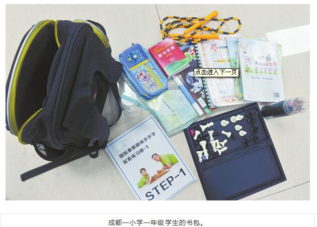 根据成都青羊区教育局2007年出台“书包限重令”,小学、初中学生书包重量应在学生体重的10%以内。以一年级的学生为例,该年龄阶(7岁)的男生标准体重为20.2—26.5公斤,女生为19.1—26.0公斤,那么他们的书包应该在2.6公斤以下。然而,10月24日、25日,记者走访成都多所小学,一年级学生的书包,最轻的也有3.2公斤,最重的达到了6.9公斤。