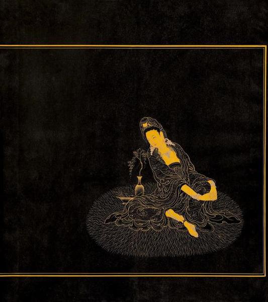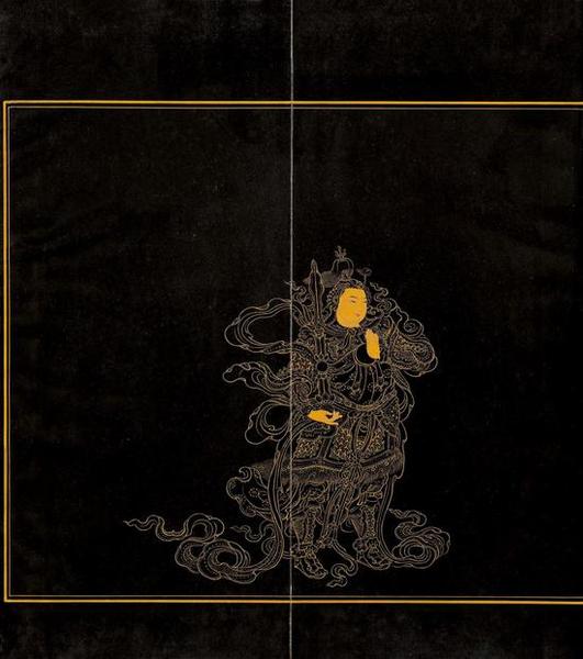 康熙帝创立了清代皇帝书经的一种“官样”楷式。内页经文一般占用四折幅,其后空一页。经文前、后附页由宫廷画师分别以抄经同样的泥金或墨笔绘制大士趺坐像、韦驮立像?;裼冒酌璺ǎ辉诜鹣竦难劬?、嘴唇、璎珞等部位略施色彩,风格细腻精谨。