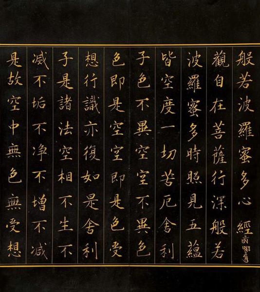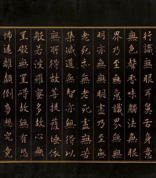 对于清代皇帝而言,书写《般若波罗蜜多心经》(以下简称《心经》)远非是单纯的书法创作,而认为此为君主借以消除灾障,致福吉祥的媒介,似乎也过于狭隘。因为《心经》不仅是博大精深的佛教经典,也被称为代表了高度哲学意义的宇宙观,所以,历代皇帝们的抄经,也蕴含、寄寓了他们通过个人的证心养性,以通达智慧实现救拔群迷、利乐众生的祈愿。