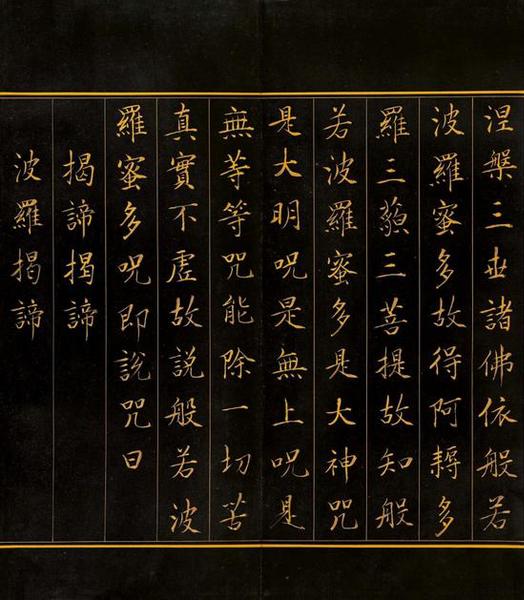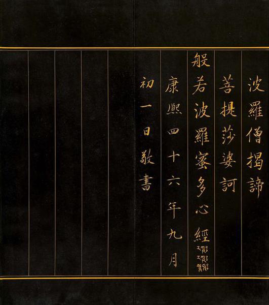 此册为墨笺本、泥金小楷书唐?玄奘译本《般若波罗蜜多心经》,纵29.5厘米,横26厘米。经文占四页,首尾书经名,经名下注文贝叶文小字,经背纸亦书贝叶文。经文后款署“康熙四十六年九月初一日敬书”,按此为康熙丁亥(1707)年,帝年54岁。册作经折装,外夹板及函套为清宫原装织锦,锦面上有泥金笺签,签上康熙帝自书经名。