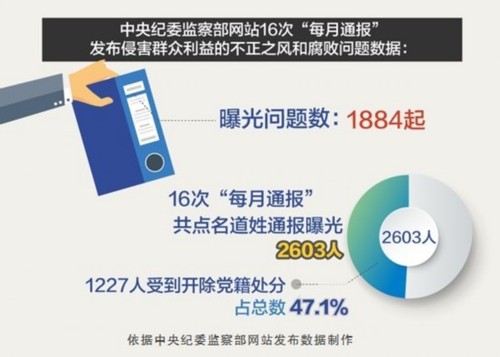 据中央纪委监察部网站“每月通报”发布数据显示,自2015年7月始,16次“每月通报”共曝光侵害群众利益的不正之风和腐败问题1884起,点名道姓通报曝光2603人,其中有1227人受到开除党籍处分,占总人数47.1%。各级纪检监察机关始终保持遏制腐败的高压态势,释放越往后执纪越严的强烈信号。